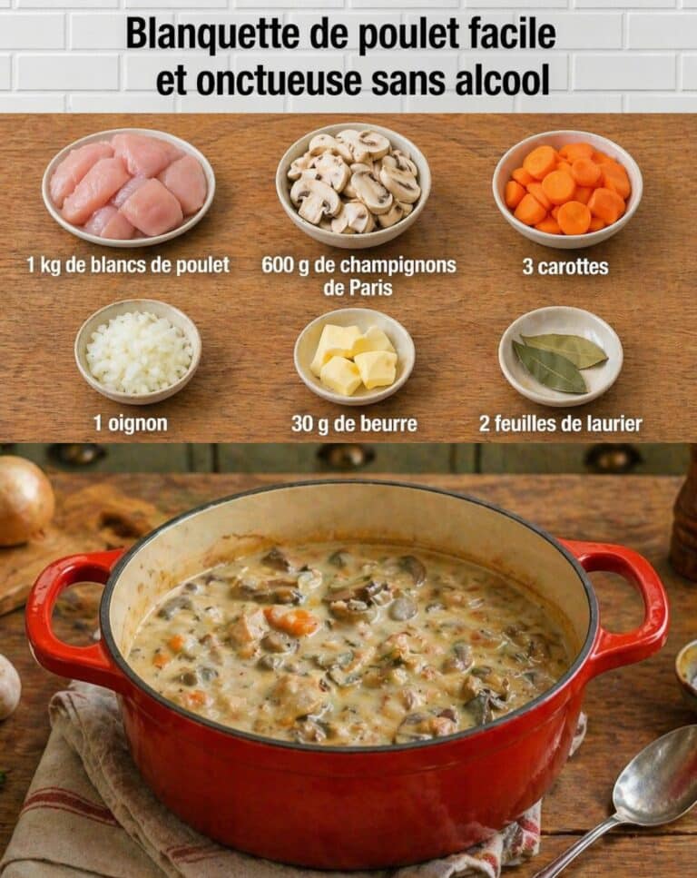 Réconfortante et pleine de douceur, cette blanquette de poulet sans alcool est une version simple et savoureuse d’un grand classique. Sa sauce crémeuse et ses légumes fondants en font un plat familial idéal, à la fois généreux et facile à réaliser.
