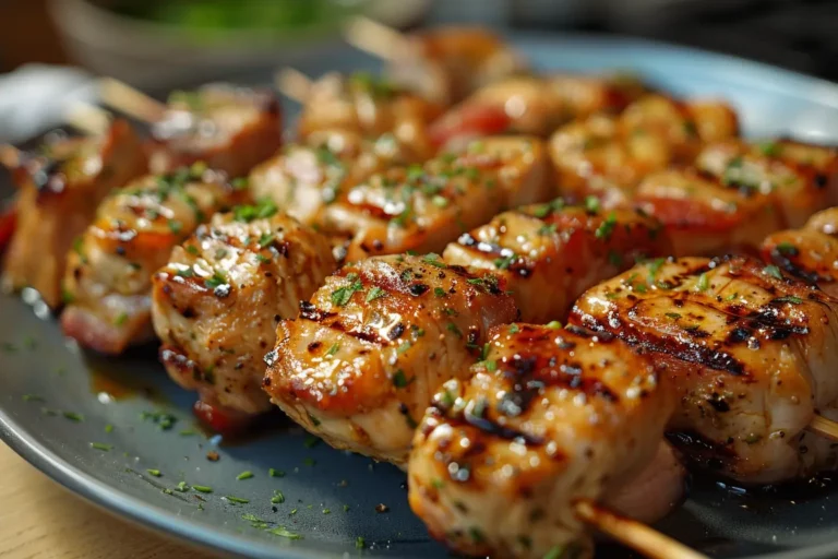 Cette recette comprend de succulentes brochettes de poulet marinées dans un savoureux mélange de miel et d’ail et enveloppées de bacon croustillant, créant un plat appétissant qui est parfait pour toutes les occasions.