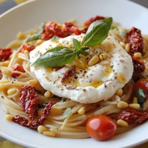 Description: Un plat de pâtes ensoleillé et gourmand, où la fraîcheur de la burrata rencontre la douceur des tomates confites et le croquant des pignons de pin. Une explosion de …