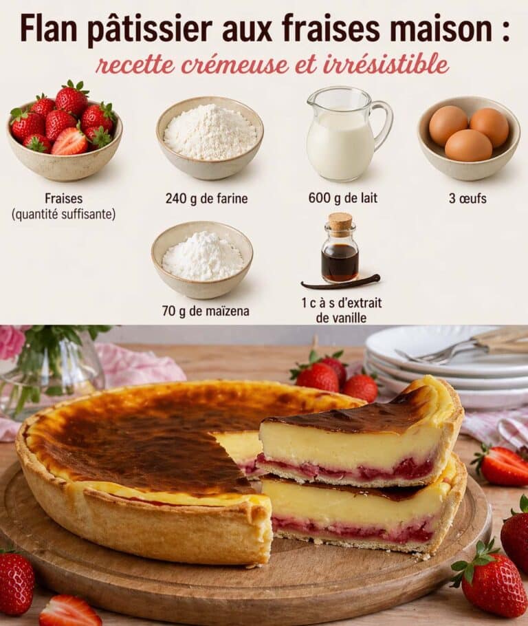 Crémeux, fondant et délicatement parfumé, le flan pâtissier aux fraises est une version gourmande et fruitée du grand classique. Entre pâte croustillante, appareil onctueux et fraîcheur des fraises, ce dessert est idéal pour régaler toute la famille.