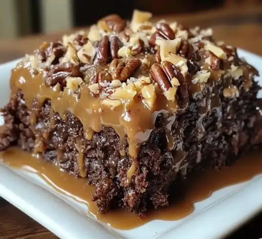 Un gâteau décadent et moelleux au chocolat noir, percé de trous et imbibé d’une sauce au caramel onctueuse, puis recouvert d’un glaçage riche au caramel, aux noix et à la noix de coco. Une gourmandise inoubliable!