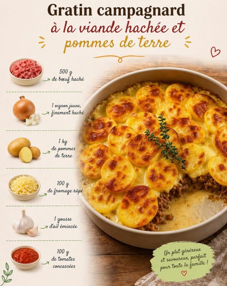 Rustique, généreux et réconfortant, ce gratin campagnard associe la richesse de la viande hachée à la douceur fondante des pommes de terre à la crème. Un plat familial complet, idéal pour les repas conviviaux.