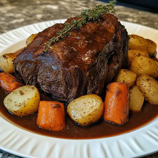 Ce rôti de bœuf braisé lentement est un classique intemporel de la cuisine familiale française. Il est mijoté doucement au four dans un bouillon savoureux, accompagné de pommes de terre fondantes et de carottes tendres. La viande devient incroyablement moelleuse, presque confite, tandis que les légumes s’imprègnent de tous les arômes du plat. Parfait pour un dimanche en famille, un dîner chaleureux entre amis ou tout simplement pour se faire plaisir avec un plat réconfortant.