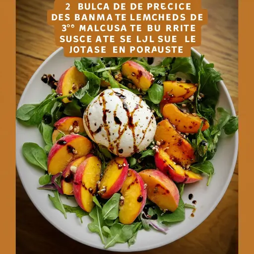 Conclusion La Salade de Pêches et Burrata avec Réduction de Balsamique est une recette simple mais élégante qui capture l’essence de l’été. Sa combinaison de saveurs et de textures en fait un plat parfait pour toutes les occasions, des déjeuners décontractés aux dîners sophistiqués. N’hésitez pas à l’adapter à vos goûts et à vos envies, en ajoutant d’autres fruits frais, des herbes aromatiques, ou des fromages différents. Laissez votre créativité s’exprimer et profitez de ce délice estival!