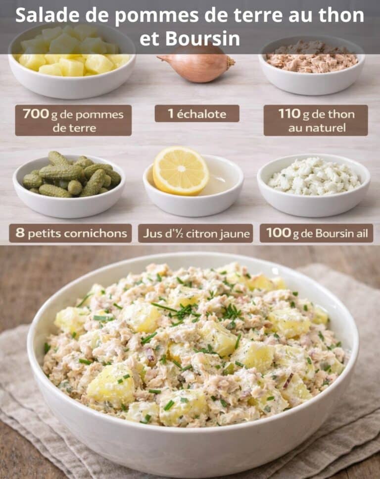 Fraîche, rapide et pleine de saveurs, cette salade de pommes de terre au thon et Boursin est idéale pour un repas léger ou un déjeuner sur le pouce. Sa sauce onctueuse et parfumée en fait une recette simple mais particulièrement gourmande.