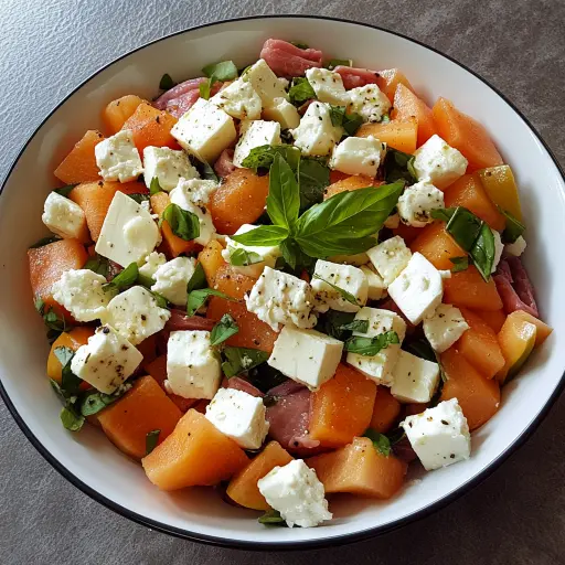 Description Une salade estivale rafraîchissante, alliant la douceur du melon, le crémeux de la feta et le goût salé du jambon cru, le tout rehaussé par une vinaigrette citronnée et parfumée au thym. Parfaite pour un déjeuner léger ou un accompagnement savoureux.