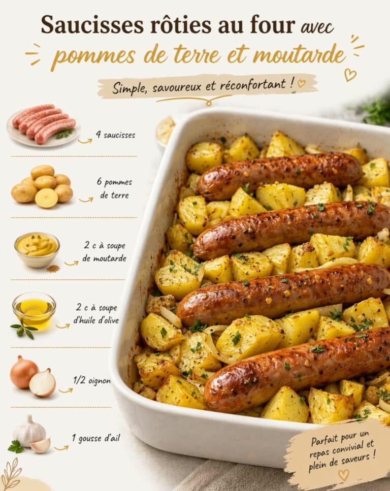 Simple, convivial et plein de saveurs, ce plat de saucisses rôties au four avec pommes de terre et moutarde est idéal pour un repas familial sans complication. Les pommes de terre deviennent fondantes et dorées, tandis que les saucisses s’imprègnent délicatement des arômes.