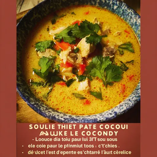 Description: Une soupe réconfortante et savoureuse, inspirée des saveurs exotiques de la Thaïlande. Cette soupe est un mélange parfait de poulet tendre, de lait de coco crémeux, de curry rouge parfumé et de nouilles de riz légères. Facile à préparer et riche en saveurs, elle est idéale pour un dîner rapide en semaine ou un repas réconfortant lors des journées plus fraîches.