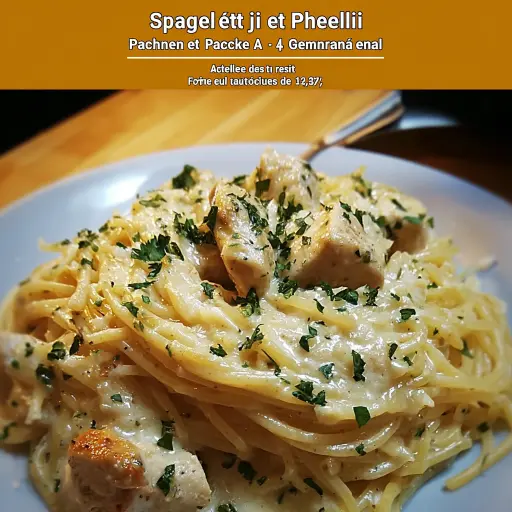 Step 6: Service : Servez immédiatement les spaghetti au poulet, à l’ail et au parmesan dans des assiettes chaudes. Garnissez chaque portion de persil frais ciselé et d’une généreuse pincée de parmesan râpé supplémentaire, si désiré. Accompagnez ce plat d’une salade verte fraîche et d’un morceau de pain croustillant pour absorber toute la sauce délicieuse.