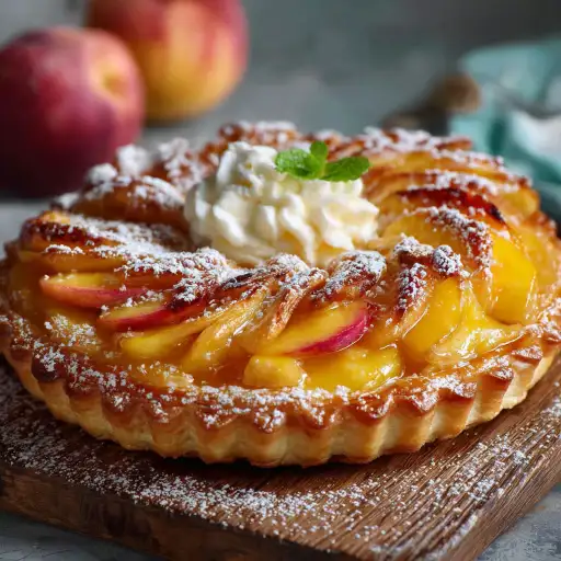 Une tarte rustique et élégante, mettant en valeur la douceur des pêches mûres sur un lit de pâte feuilletée croustillante. Parfaite pour un dessert d’été léger et savoureux.