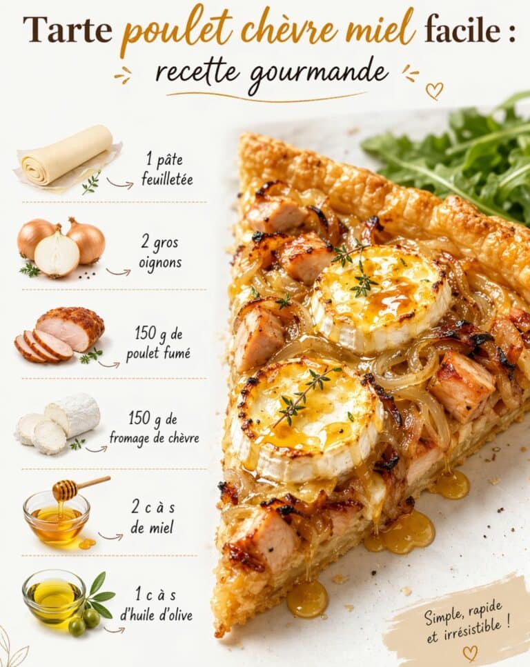 Gourmande et pleine de contrastes, cette tarte au poulet, chèvre et miel est une parfaite alliance sucrée-salée. Facile à préparer, elle offre une pâte croustillante, une garniture fondante et une touche de douceur irrésistible.