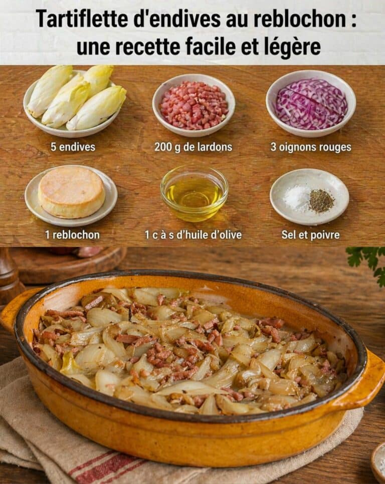 Plus légère que la version traditionnelle, la tartiflette d’endives au reblochon revisite ce grand classique savoyard avec une touche de fraîcheur. Légèrement amères, les endives s’équilibrent parfaitement avec le fondant du fromage et le goût fumé des lardons.